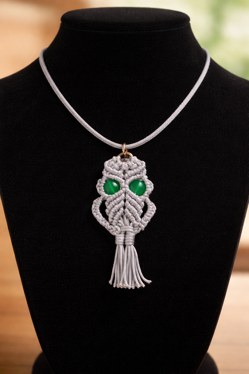 Collar búho color gris claro tejido en Macrame