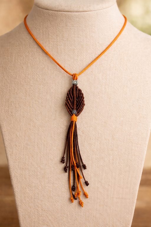 Collar de hoja tejida en macrame color naranja con hilo chino de 1 mm, cadena en encerado color cafe con 10 argollas para ajuste y detalles de cubos en metal. Largo aproximado 32 cms. Única unidad.